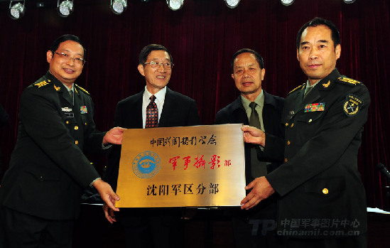 中國新聞攝影學會主席于寧、副主席江志順向沈陽軍區(qū)宣傳部授“中國新聞攝影學會軍事攝影部沈陽軍區(qū)分部”牌匾。