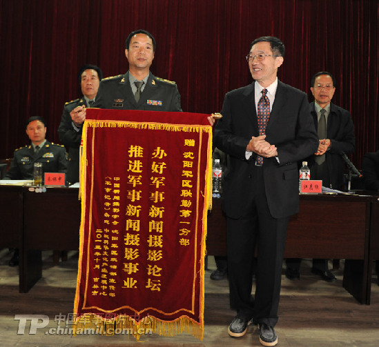 中國新聞攝影學會主席于寧向沈陽軍區(qū)聯(lián)勤部第一分部頒發(fā)獎旗。趙佳慶攝