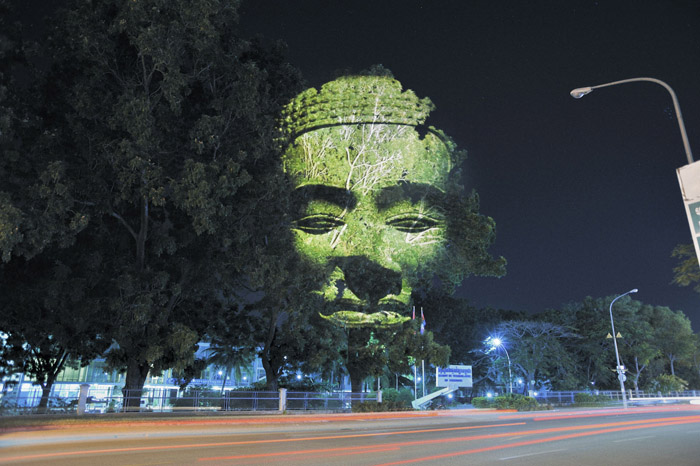 ????這是法國攝影師Clément Briend在柬埔寨城市金邊所拍攝的系列藝術作品。柬埔寨文 化認為人們所居住的世界是具有靈性和意識的,這些樹木都有自己的神奇化身。到了 夜晚,這些化身就會顯靈。借由這樣的靈感,Clément Briend用投影儀投射石像到樹 木表面。樹木造型和機理與投影石像一起組合形成了具備靈性的城市景觀影像。