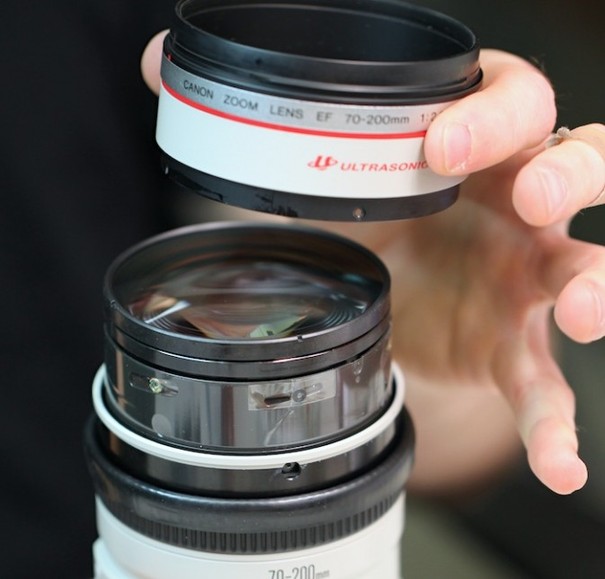 要拆除前鏡組,必須先移除鏡頭前端的濾鏡環(huán)。反折對焦環(huán)橡膠,露出隱藏在下面的固定螺絲。