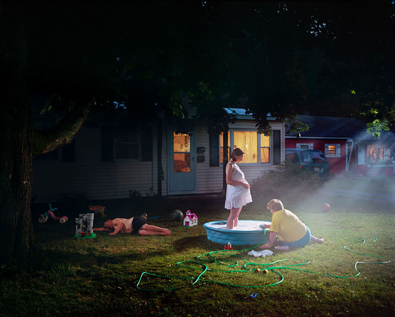 格里高利-克魯?shù)逻d(Gregory Crewdson)是美國一位非常另類的攝影師,非常有意思的是,評論界在介紹這位攝影師時都會不約而同地將他與一名非常著名的電影導(dǎo)演相提并論,那就是斯蒂芬·斯皮爾伯格(Steven Spielberg)??吹娇唆?shù)逻d的一些作品,會使人想起斯皮爾伯格拍攝的電影《第三類接觸》,雖然攝影作品描述的只是一個片斷,但足以使人產(chǎn)生一種驚悚而且非常怪異的感覺。其實克魯?shù)逻d拍攝作品時動用的人力以及其他各方面的資源足以可以和拍攝電影相媲美。為了拍攝一幅攝影作品,克魯?shù)逻d可以雇傭三、四十名工作人員布置演員、場景、燈光等等,在這種情形下,他的職責則更像一名導(dǎo)演,他所導(dǎo)演拍攝的就是生活在近郊的那些美國人,而這些美國人的生活環(huán)境正是他自己所熟悉的。