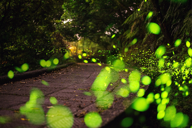 螢火蟲(chóng)的光亮在鏡頭前脫焦,使照片更有立體感。