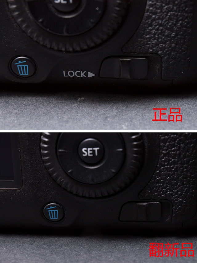 很多翻新品機身表面的標識都會莫名其妙的缺失一些字樣,筆者以前見到過一臺翻新的EOS 5D Mark II,模式撥盤的指示白橫線被翻新作坊新噴的漆給掩蓋掉了。