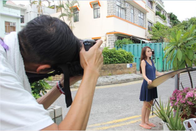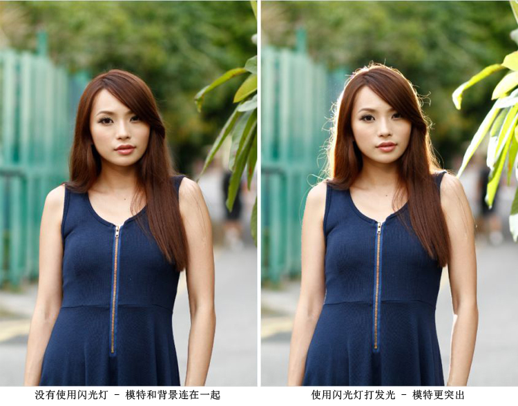 很多時(shí),若模特穿著深色的衣服拍攝,很容易與同樣深色的背景分不開,最好當(dāng)然是換個地方拍攝或者指示模特?fù)Q成較淺色的衣裝,攝影人亦可以在模特的正背后,以閃光燈面向鏡頭直打,攝影人大可以手動調(diào)校閃光燈輸出,打出發(fā)光的效果,讓模特與背景分離,突出模特。另外,更可以利用反光板為模特近距離的補(bǔ)光,減低陰影之馀,形成漂亮的眼神光,看起來更有精神。