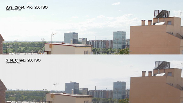 上圖顯示出兩款機器4K視頻的動態(tài)范圍差異,A7s畫面天空部分的細節(jié)更豐富。其中A7s和GH4分別在Cine4和Cine D模式下拍攝,感光度ISO 200,外接硬盤記錄器,ISO 200。