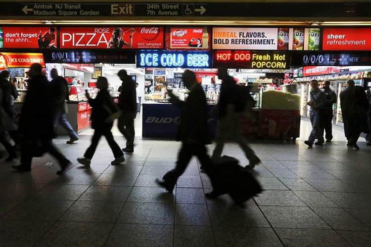 圖為美國(guó)紐約,紐約Penn Station里,通勤者匆匆忙忙從各式小吃店門前快步走過。這座美國(guó)最繁忙火車站建于20世紀(jì)60年代,位于麥迪遜廣場(chǎng)花園的地下。據(jù)說20年前就出臺(tái)了Penn Station的擴(kuò)建方案,但至今仍沒有看到明顯的改善跡象。