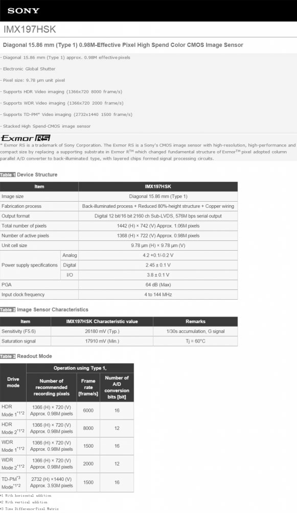 近日,索尼公司悄然公開了用于超高速攝影的IMX197HSK傳感器。該影像傳感器采用了Exmor RS結構,有效分辨率1355×720像素,能夠在分辨率全開的情況下實現(xiàn)8000fps的超高速連續(xù)拍攝(不限時)。由于該CMOS采用了電子全局電子快門結構,因此在如此高的幀率下,也不會受到傳統(tǒng)CMOS的“果凍效應”的影響。