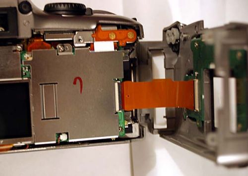 2.8小心的(此時必須緩慢!)提起相機后蓋。此時,后蓋和主機之間仍然有一條排線。這條排線是CF卡艙的數(shù)據(jù)線。