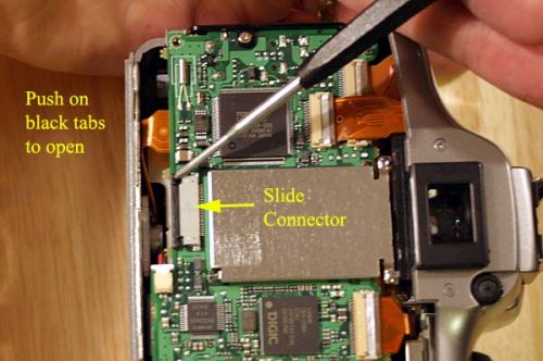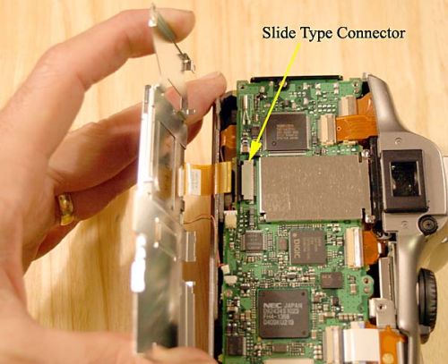 2.13 小心地抬起LCD和金屬板。注意!LCD的下方還有一截連接的電線。和CF卡艙的數(shù)據(jù)線不同,這段電線為滑動(dòng)連接方式。拆卸時(shí)先向相機(jī)底部方向推動(dòng)插銷(xiāo)處的黑色扳機(jī)(如果手指太大,可使用一字螺絲刀),就可以取出電纜了。然后取下LCD,這時(shí),眼前出現(xiàn)一塊相當(dāng)大的金屬板。