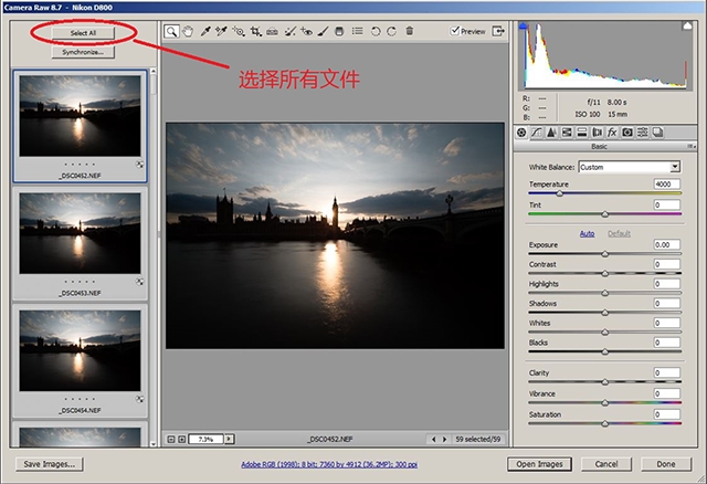 將這幾十張圖同時選中,拖拽進(jìn)入Photoshop,會自動彈出ACR(Adobe Camera Raw)界面解RAW。點(diǎn)擊左上角的“選擇全部”選中所有RAW文件即可進(jìn)行批量操作。這時候建議順便對鏡頭進(jìn)行色散矯正和暗角矯正、統(tǒng)一所有RAW的白平衡。