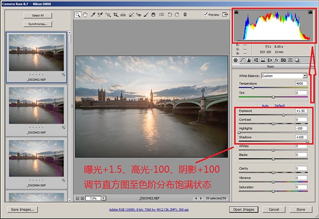 接下來的一步則是關(guān)鍵了:從RAW文件里盡可能多的恢復(fù)出來陰影細(xì)節(jié)與高光細(xì)節(jié)。不同的場景可能需要略微不同的前期曝光參數(shù)與后期調(diào)整參數(shù),但是總體思路是一致的,就是采用如下這種“高光-100、陰影+100”的暴力方法,再借助曝光與對比度這幾個選項(xiàng)調(diào)節(jié),將直方圖調(diào)節(jié)為色階過渡豐富飽滿的形狀,理想的直方圖形狀請參考陳夢立 @陳夢立-香菜 的教程《我個人對色彩的理解》