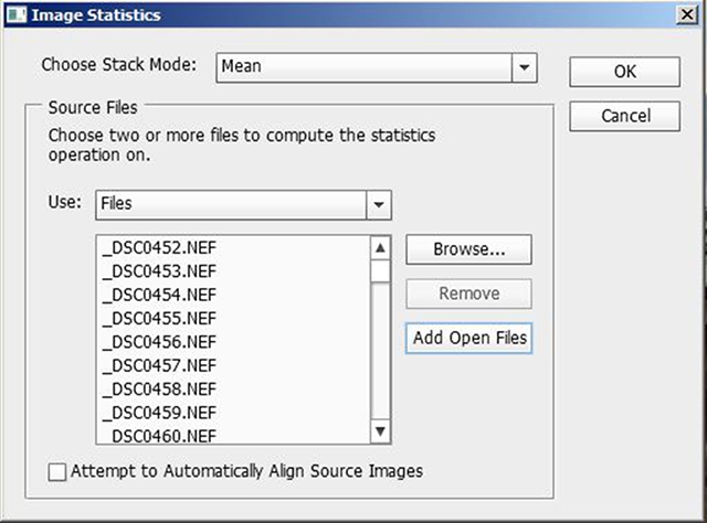 點(diǎn)擊“添加已打開的文件”,選擇“平均值”,點(diǎn)擊確定。(如果不是腳架在風(fēng)中不穩(wěn)、腳架在淤泥里逐漸下沉、相機(jī)被擾動、或者甚至是手持拍攝的一類的特殊情況,這里不建議勾選“自動對齊”,因?yàn)镻hotoshop的自動對齊經(jīng)常不準(zhǔn)。)接下來就是交給電腦進(jìn)行運(yùn)算了。運(yùn)算完畢之后,會發(fā)現(xiàn)幾十張照片(每張8秒曝光)被疊加為了一張幾分鐘長曝光效果的照片。