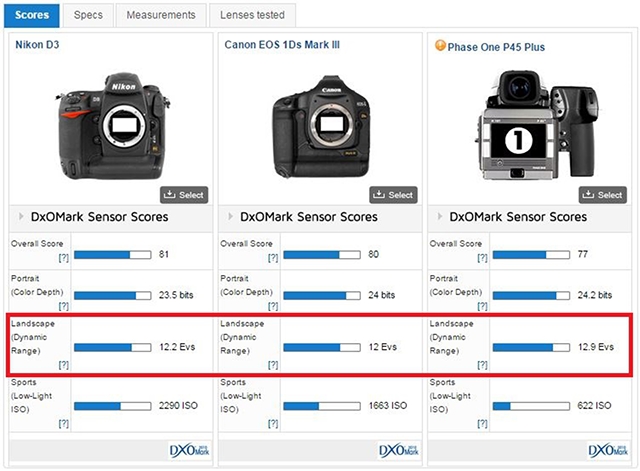 其實(shí)對(duì)于傳感器寬容度的定量分析,DxOMark早就有做過,只是眾多攝影師對(duì)其嗤之以鼻,認(rèn)為其冷冰冰的數(shù)據(jù)并不能與攝影師的照片內(nèi)容所發(fā)掘的真善美有任何相關(guān)性,或者認(rèn)為DxOMark的測(cè)試結(jié)果是暴力粉尼康和索尼、暴力黑佳能,甚至有不少朋友認(rèn)為D800E在DxOMark的寬容度跑分超越了飛思中畫幅數(shù)碼后背非?;闹嚒J聦?shí)上筆者耗費(fèi)了很多的心力折騰了一圈的數(shù)碼后背器材走了很多彎路,才發(fā)現(xiàn)自己的測(cè)試結(jié)果和DxOMark的數(shù)據(jù)是相符的。DxOMark將寬容度(Dynamic Range)分?jǐn)?shù)又稱作風(fēng)光(Landscape)分?jǐn)?shù),其實(shí)也印證了DxOMark的看法亦是:對(duì)于風(fēng)光攝影而言,畫質(zhì)是受限于寬容度的。