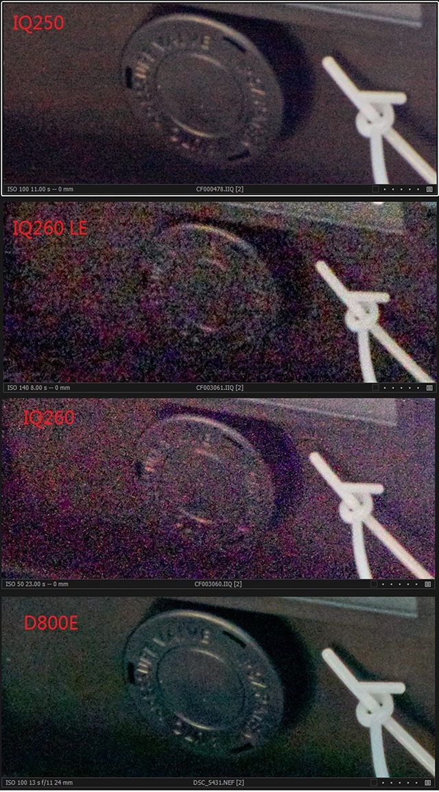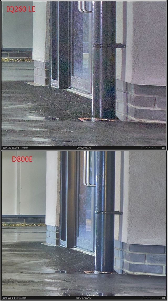 那么D800E在同樣的條件下表現(xiàn)如何呢?以下為筆者親自拍攝的D800E+24mm f/1.4G與IQ250/IQ260+40HR的嚴(yán)重欠曝對(duì)比(RAW文件下載地址),可以看到D800E的陰影信噪比驚人的高,遠(yuǎn)遠(yuǎn)的超越了IQ260(所以更是比IQ280強(qiáng)),與IQ250是同級(jí)別的水準(zhǔn)。