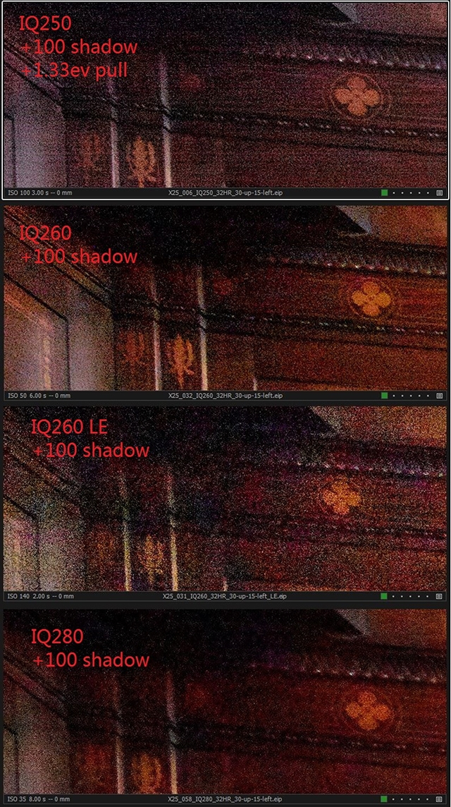 感謝龍壕@Bonnieazuresky讓我有幸能用數(shù)碼后背搭積木!靠我的財(cái)力自然是不可能接觸到這么多昂貴的器材來寫評(píng)測(cè)了。首先帶給大家的是長(zhǎng)曝光時(shí)IQ280、IQ260與IQ250的陰影恢復(fù)能力對(duì)比,可以看到IQ280的陰影信噪比最低,在Capture One里默認(rèn)的降噪涂抹最狠,剩余細(xì)節(jié)最少,而IQ250這個(gè)殘副CMOS則是明顯的勝過兩個(gè)645畫幅的CCD。