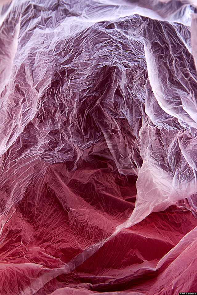 塑料袋,這種我們司空見慣的生活用品對攝影來說有什么用呢?挪威藝術(shù)家Vilde Rolfsen就想到用它當(dāng)拍攝道具,塑料袋表面的褶皺起伏恰似萬年冰川和冰雪覆蓋的山脈,再配合簡單的背景光源,營造出充滿中土氛圍的風(fēng)光作品。