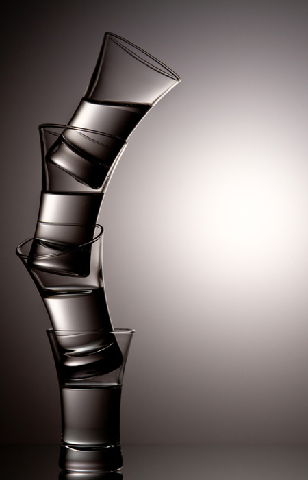 3、背景中間亮、四周暗的漸變色布光 要表現(xiàn)背景中亮、四周暗的黑線條玻璃器皿效果,與在乳白色有機(jī)玻璃背景靜物背景后面的燈光照明范圍要小些,背景的垂直部分離主體距離稍遠(yuǎn)些,以便形成中間亮區(qū)。調(diào)整燈的距離,可以改變亮度和區(qū)域范圍,并控制其在畫(huà)面上的大小,以獲得亮的拍攝效果。