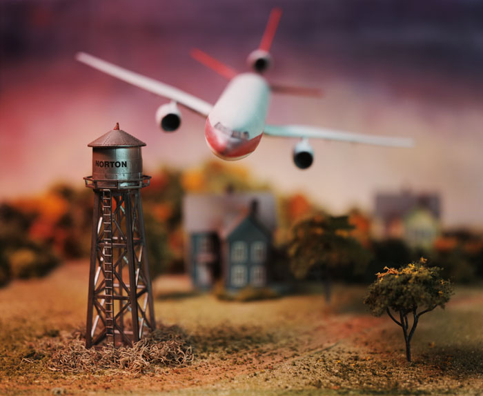 這一組照片《事故中的堪薩斯州》亦是他的最新之作,照片中的堪薩斯州經(jīng)歷著車禍、墜機、雪崩、洪澇、飛艇事故、干旱、蟲災(zāi)、核泄漏、雷擊、颶風(fēng)、火車出軌等一系列事故,可謂多災(zāi)多難,然后在移軸攝影獨特的視角之下,我們看到的是一個孩童般的世界,有著一種對事故處亂不驚的鎮(zhèn)靜。漂亮的色彩和安靜的畫面,不仔細看都讓人忘了實則是一些觸目驚心的災(zāi)難現(xiàn)場,攝影師似乎想以此來讓觀者放寬心,坦然面對自然或人為的變故。