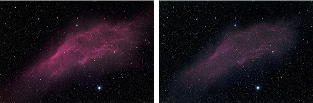 由于通常的數(shù)碼單反相機(jī)是為人像和風(fēng)景攝影而設(shè)計(jì),為了優(yōu)化此類場景的色彩還原而抑制了紅色可見光范圍附近的透光率。因此,使用這些相機(jī)拍攝來自星云和星系的帶有H-α射線的圖像時(shí),常常照片顏色偏淡。為了解決此問題,D810A在影像傳感器的前方采用了IR-cut光學(xué)濾鏡,使H-α射線透光率相對(duì)D810同比高約4倍。這樣便能獲得令發(fā)射紅光的星云和星系呈現(xiàn)鮮艷紅色的天文照片。