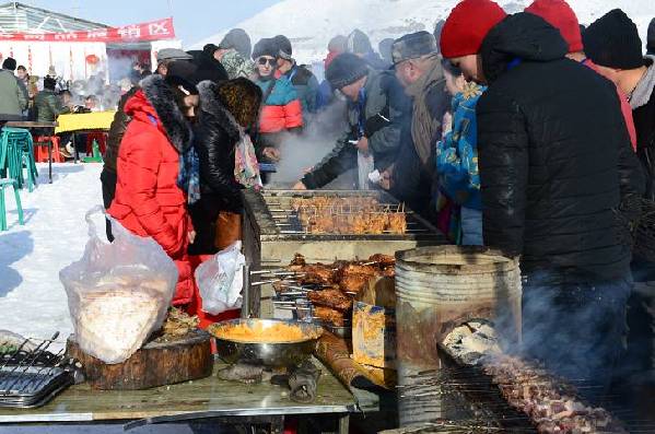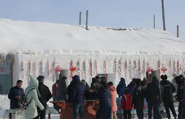 圖為與冰雪節(jié)同期舉辦的冬季美食節(jié)上,游客爭相品嘗各種特色美食。