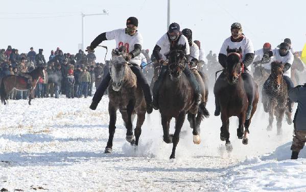 作為本屆冰雪旅游節(jié)系列活動之一的伊犁種馬場“雪地飛龍”賽馬會如期舉行, 50余名選手參加了比賽。選手們策馬揚(yáng)鞭,你追我趕;賽場外,前來觀賽的游客吶喊助威,比賽現(xiàn)場馬嘶聲、掌聲響成一片。