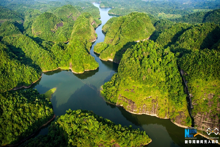 在新華網(wǎng)無(wú)人機(jī)的鏡頭下,江西撫州廣昌丹霞地貌的綠水青山、遠(yuǎn)處幾戶人家、山間一片草地,渲染出一幅人與自然和諧相處的畫(huà)卷。新華網(wǎng)楊益民攝 飛手 江遠(yuǎn)賓