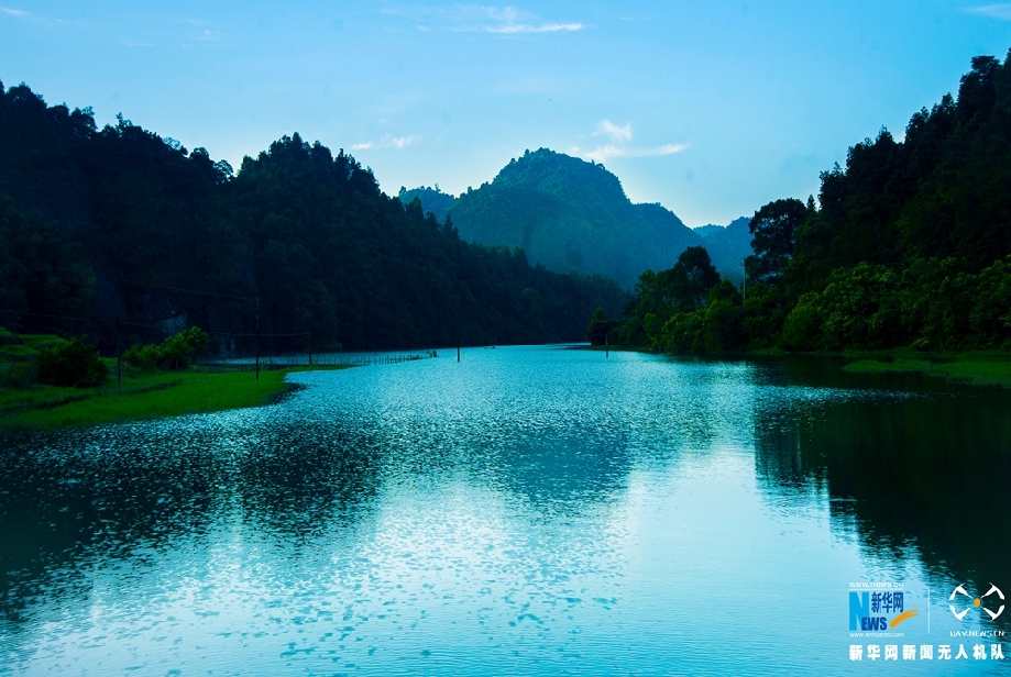 在新華網(wǎng)無人機的鏡頭下,江西撫州廣昌丹霞地貌的綠水青山、遠(yuǎn)處幾戶人家、山間一片草地,渲染出一幅人與自然和諧相處的畫卷。新華網(wǎng)楊益民攝 飛手 江遠(yuǎn)賓