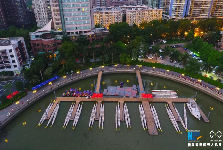 航拍??吭诖a頭,等待參加比賽的龍舟。新華網(wǎng)發(fā) 吳建業(yè)攝