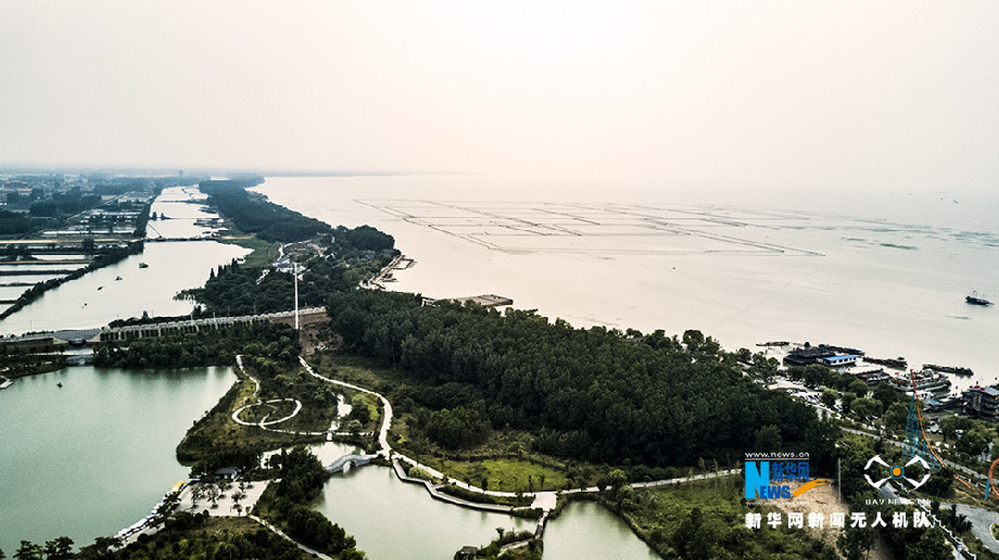 洪澤湖大堤是世界文化遺產(chǎn),位于江蘇省淮安市,全長70余公里,距今已有1800年的歷史,被譽(yù)為“水上長城”??罩懈╊闈珊蟮?,大堤沿著湖面蜿蜒曲折向南,大堤之上樹木成林、郁郁蔥蔥。大堤一側(cè)漁船點(diǎn)點(diǎn);大堤另一側(cè)是城市、村莊、麥田、魚塘。傍晚時(shí)分,夕陽灑在湖面上,湖水像是鍍了層金。新華網(wǎng)發(fā)應(yīng)小蘭攝