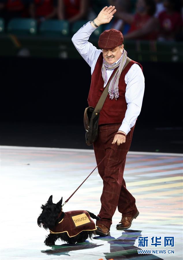狗年新春將至,為大家展現(xiàn)一組熱愛運(yùn)動(dòng)的“萌狗”。圖為在第20屆英聯(lián)邦運(yùn)動(dòng)會(huì)開幕式上,衣服上印著代表團(tuán)名字的“蘇格蘭梗”作為引導(dǎo)引領(lǐng)孟加拉國代表團(tuán)入場(2014年7月23日攝)。新華社記者王麗莉攝