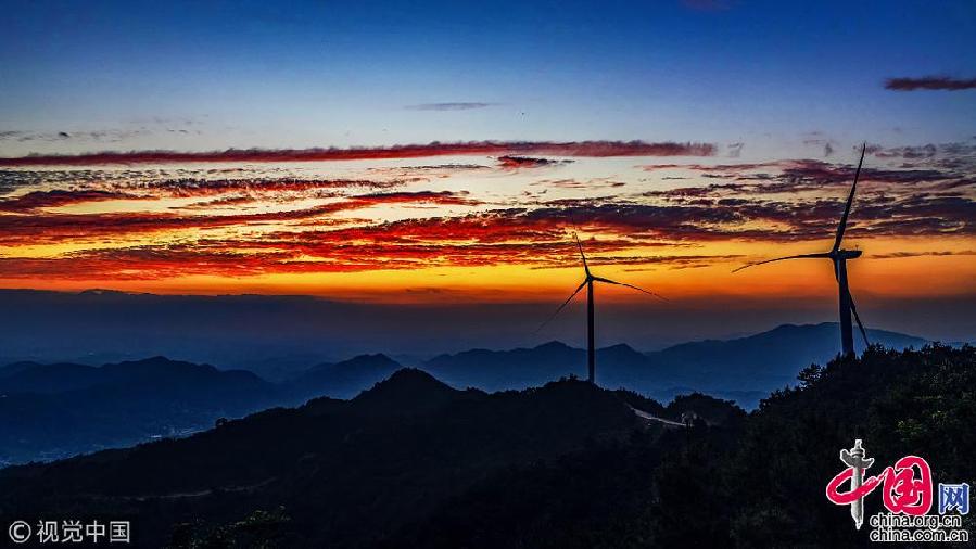 2018年6月6日,湖南婁底,晚霞映照著山上的風(fēng)塔。