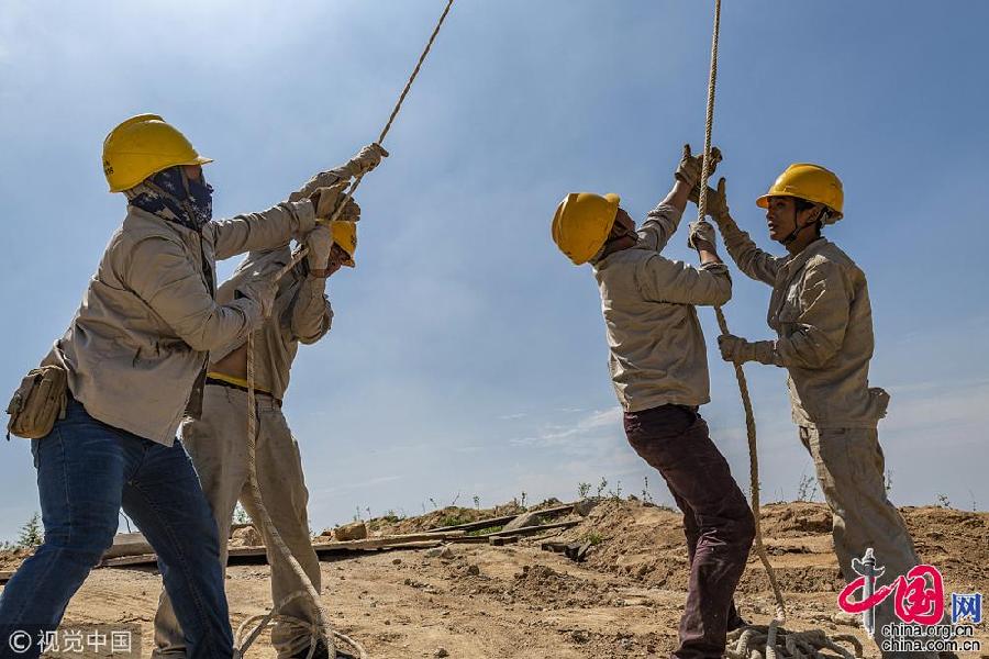 2018年6月11日,湖南婁底,裝高空設(shè)備時(shí)必須齊心協(xié)力,勁往一處使才能保持平衡。
