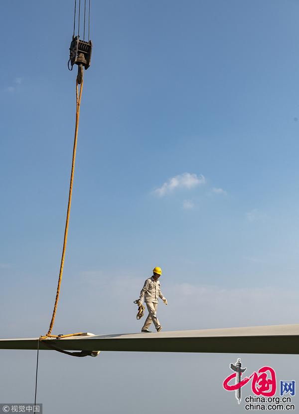 2018年6月16日,湖南婁底,組裝風(fēng)葉的工人在半空的風(fēng)葉上如履平地,這個(gè)高度在旁人看起來著實(shí)有點(diǎn)心驚膽戰(zhàn),這就是俗話說的“藝高人膽大”吧。