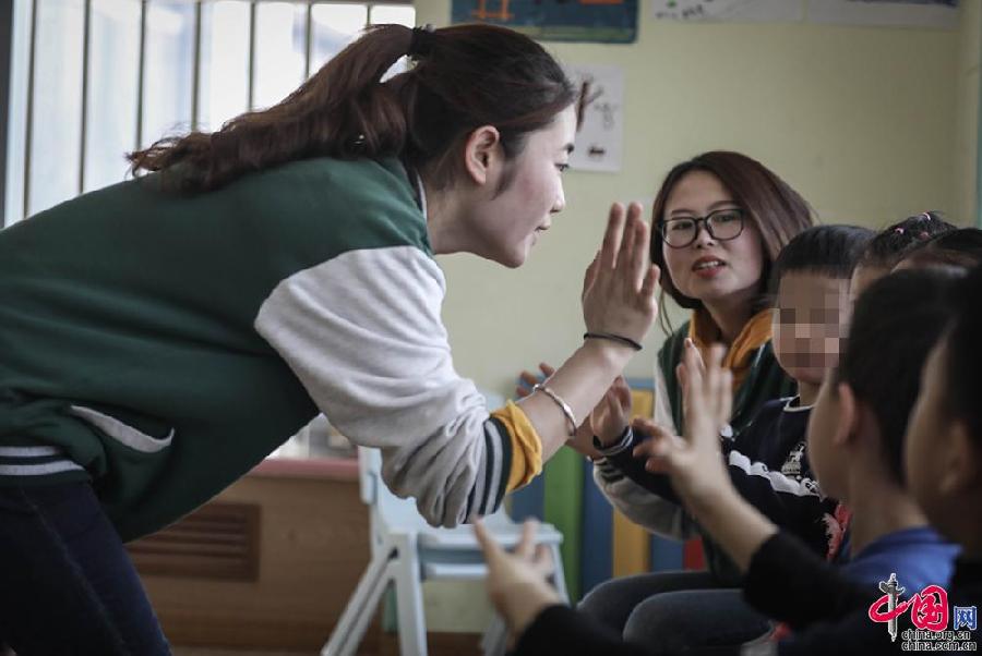 在孩子們聽到自己的名字并一一答到之后,90后康復師張曉玉與他們挨個擊掌,夸獎那些順利完成“任務(wù)”的孩子們。今年25歲的張曉玉已經(jīng)工作兩年半,從特教專業(yè)畢業(yè)后,她成為了一名康復師。在她眼中,這些孩子們并不特殊。他們是天使,是遺落在地球上的星星,更是眾多可愛的小朋友中普通的一員。這群孩子與普通孩子唯一的區(qū)別就是需要更多的耐心和愛心來關(guān)愛他們。中國網(wǎng)記者倫曉璇 攝