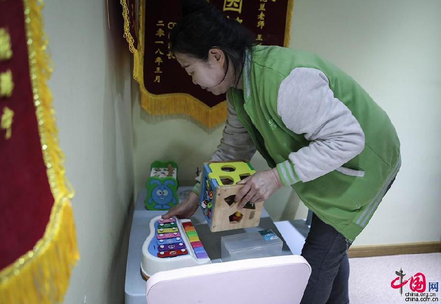 曹芳曾在北醫(yī)六院兒童病房從事20多年的護理工作,退休之后來到北大醫(yī)療腦健康兒童發(fā)展中心。從護理工作轉(zhuǎn)入孤獨癥康復一線工作,對曹芳來說還有很多要學習,但多年的兒童護理工作經(jīng)驗也讓她有更多的心得和體會。除了安慰家長,由于孤獨癥兒童通常無法很好地控制自己的情緒,曹芳也會用一些小玩具來安撫孩子們,或者先冷處理,等孩子的情緒發(fā)作一段時間之后再進行勸說和安慰,慢慢過渡到正常的交談中。中國網(wǎng)記者倫曉璇 攝