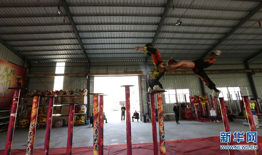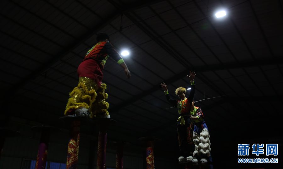 南獅主要套路有"采青" "高臺飲水" "踩梅花樁"等。圖為隊員在廟會上進行高樁表演。