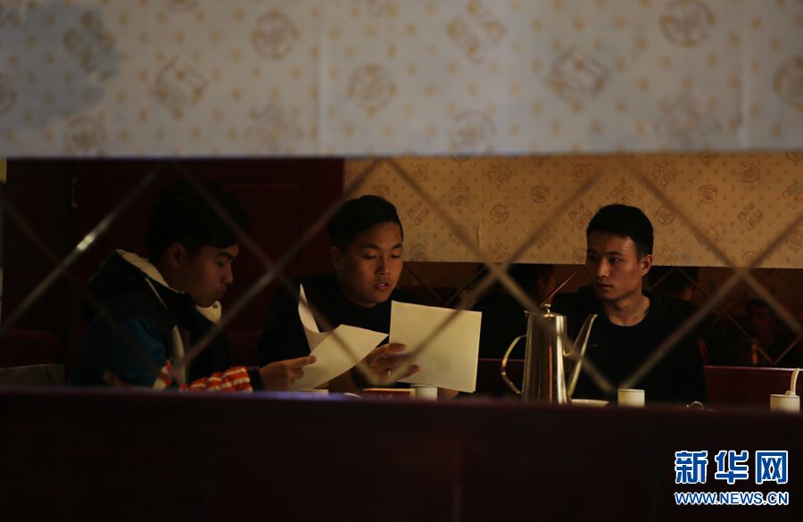 今年27歲的閆振宗(右一)在研究演出合同。他和王海斌在大學(xué)是一個舞獅社團,目前在隊里負責(zé)后勤保障。