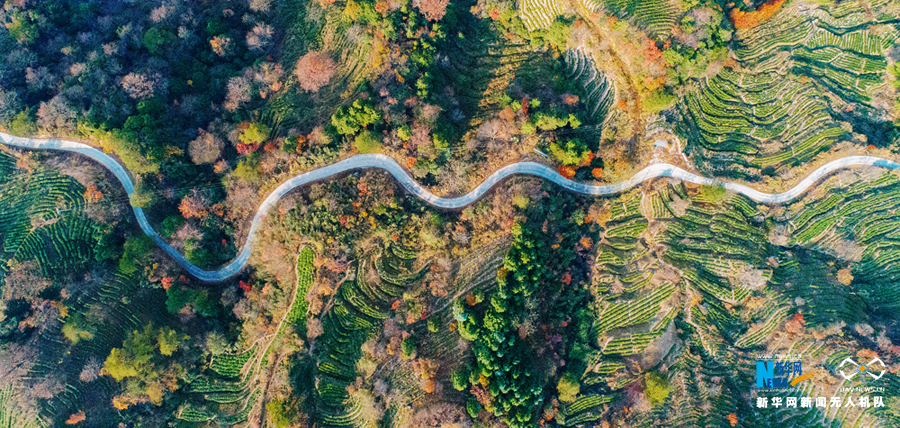 這是11月24日航拍的安徽省青陽(yáng)縣陵陽(yáng)鎮(zhèn)黃石溪村周邊的鄉(xiāng)村公路。新華網(wǎng)發(fā)(陳磊 攝)