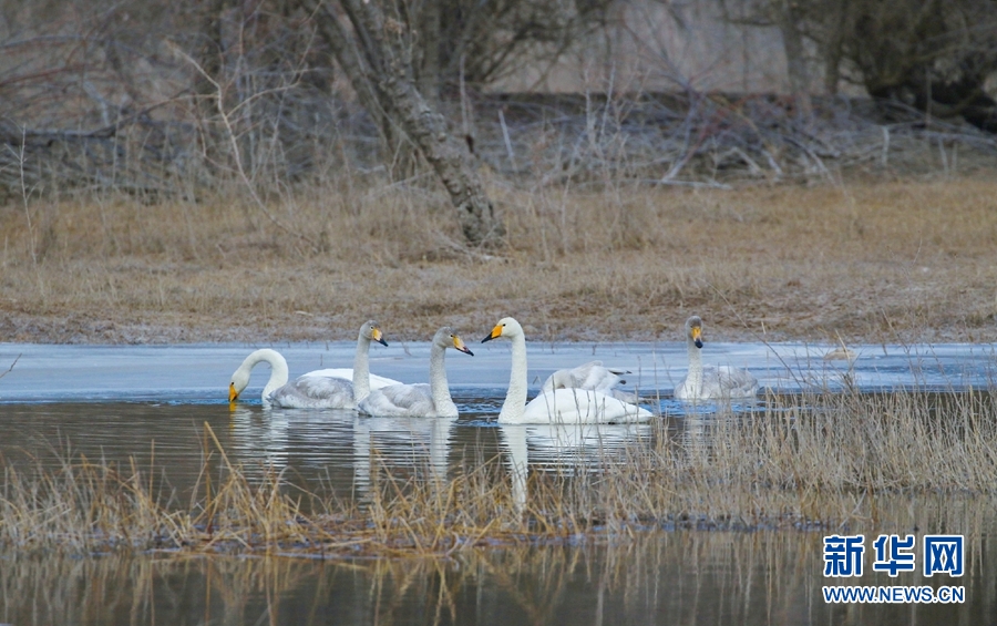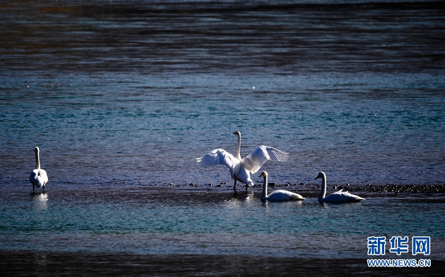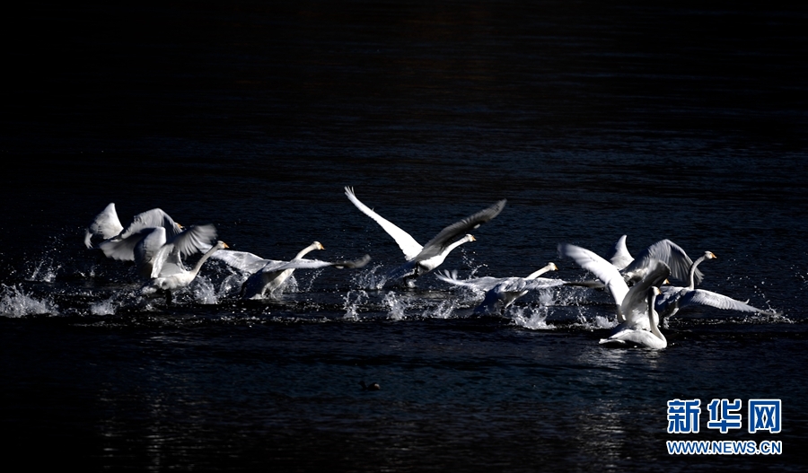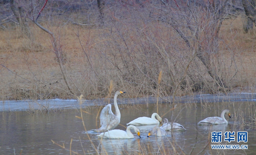 一群天鵝在千姿湖嬉戲。新華網(wǎng)發(fā)(宋忠勇攝)