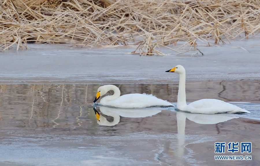 兩只天鵝在千姿湖中游弋。新華網(wǎng)發(fā)(宋忠勇攝)