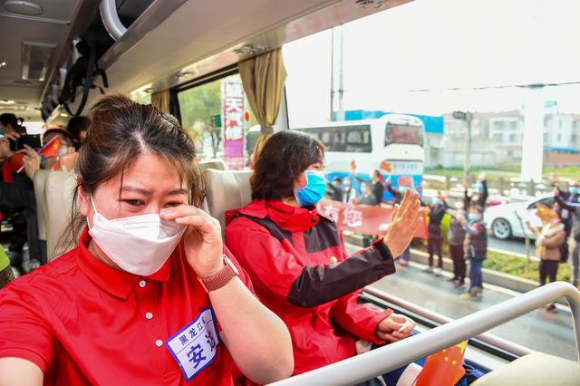 3月21日,一名黑龍江醫(yī)療隊(duì)員乘坐大巴離開(kāi)漢川市,不禁落淚。