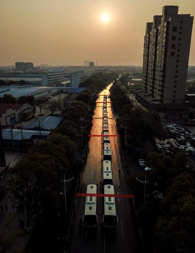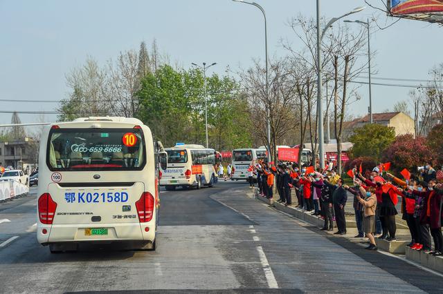 3月21日,載有黑龍江醫(yī)療隊(duì)員的大巴車隊(duì)行駛在漢川市,沿途市民前來(lái)送行。