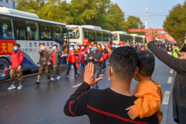 3月21日,在湖北省漢川市,一對(duì)父子在街邊向即將登車的黑龍江醫(yī)療隊(duì)員揮手致意。