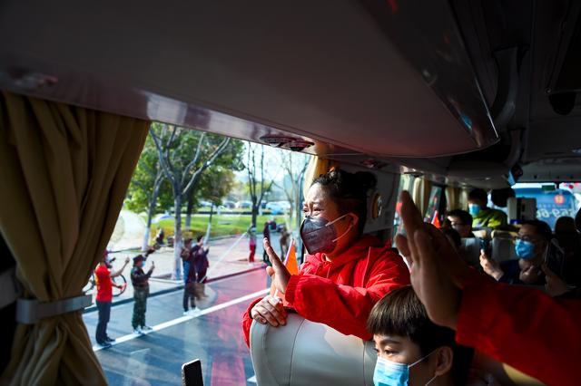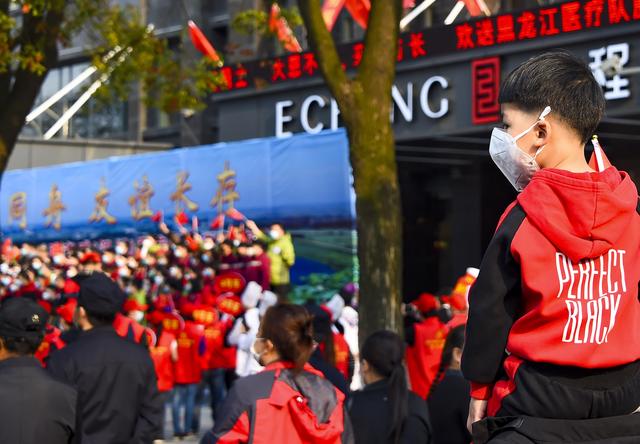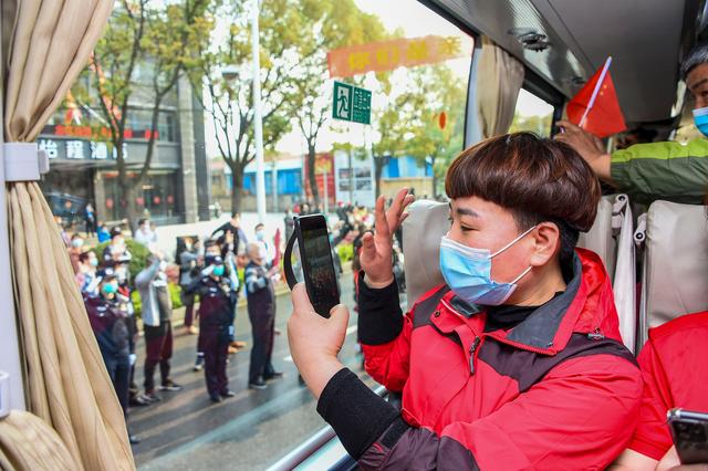 3月21日,黑龍江醫(yī)療隊(duì)員向前來(lái)送行的漢川市民揮手告別。