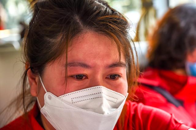 3月21日,一名黑龍江醫(yī)療隊(duì)員乘車離開(kāi)漢川時(shí)擦拭眼淚。