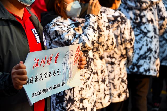 3月21日,一名黑龍江醫(yī)療隊(duì)員在湖北省漢川市的告別儀式上,向前來(lái)送行的市民展示祝福語(yǔ)。