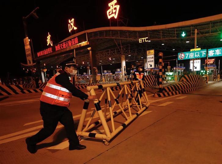 4月8日凌晨,在武漢北高速收費(fèi)站,工作人員移除圍欄。 4月8日零時(shí)起,武漢市正式解除離漢離鄂通道管控措施,有序恢復(fù)對(duì)外交通。新華社記者 肖藝九 攝