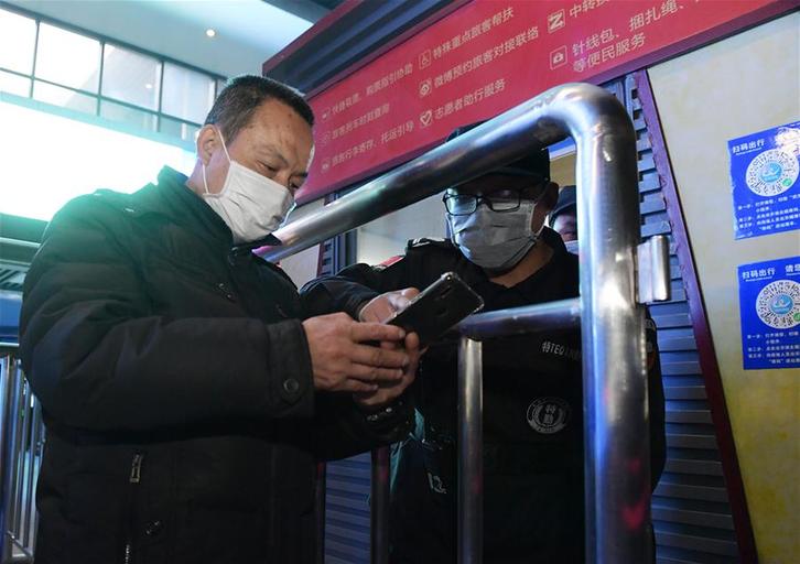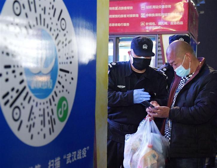 4月7日晚,旅客在武昌火車站向工作人員出示健康碼。 4月8日零時(shí)起,武漢市正式解除離漢離鄂通道管控措施,有序恢復(fù)對(duì)外交通。新華社記者 費(fèi)茂華 攝