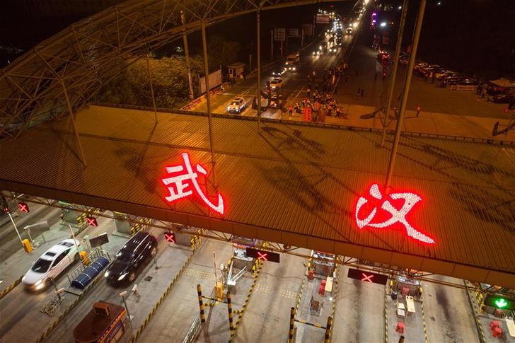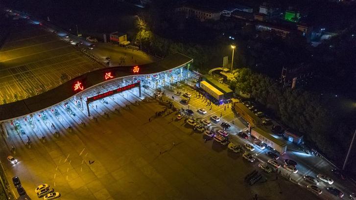 4月8日凌晨,車輛通過武漢西高速收費(fèi)站(無人機(jī)照片)。 4月8日零時(shí)起,武漢市正式解除離漢離鄂通道管控措施,有序恢復(fù)對(duì)外交通。 新華社記者 沈伯韓 攝