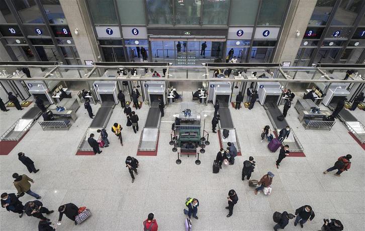 4月7日晚,旅客接受安檢后進(jìn)入武昌火車站。 4月8日零時(shí)起,武漢市正式解除離漢離鄂通道管控措施,有序恢復(fù)對(duì)外交通。新華社記者 費(fèi)茂華 攝